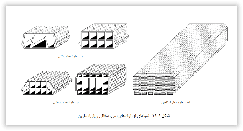 بلوك سقفي قطعه اي است پيش ساخته و توخالي كه در بين دو تيرچه قرار گرفته و با توجه به ضخامت سقف و فاصله بين تيرچه ها، ابعاد آن متغير مي باشد (شکل 1-11) نمونه اي از بلوك هاي بتني، سفالي و پل ياستايرن را نشان مي دهد